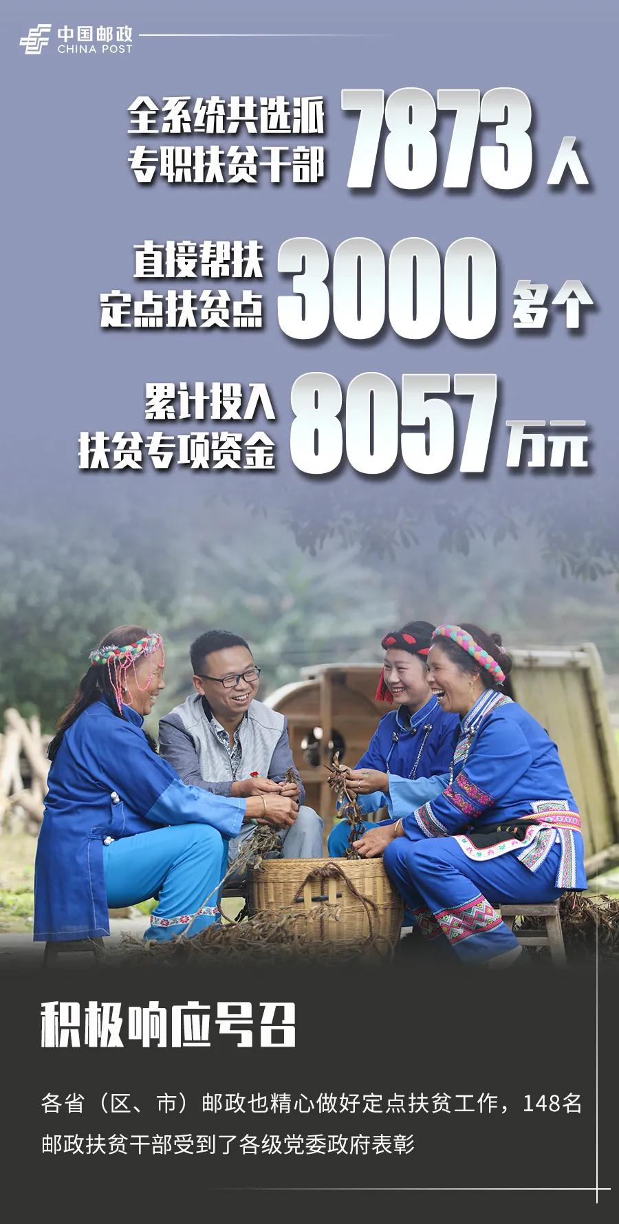在脱贫攻坚这场由中国共产党带领人民消除贫困的伟大事业中,中国邮政也交出了“国家队”的时代答卷。通过定点扶贫、电商扶贫、金融扶贫、公益扶贫等举措,融汇为中国邮政特点突出、协同整合的立体化扶贫方案,落地实施有如千帆竞发、百舸争流,为精准扶贫提供了邮政思路、邮政办法。
