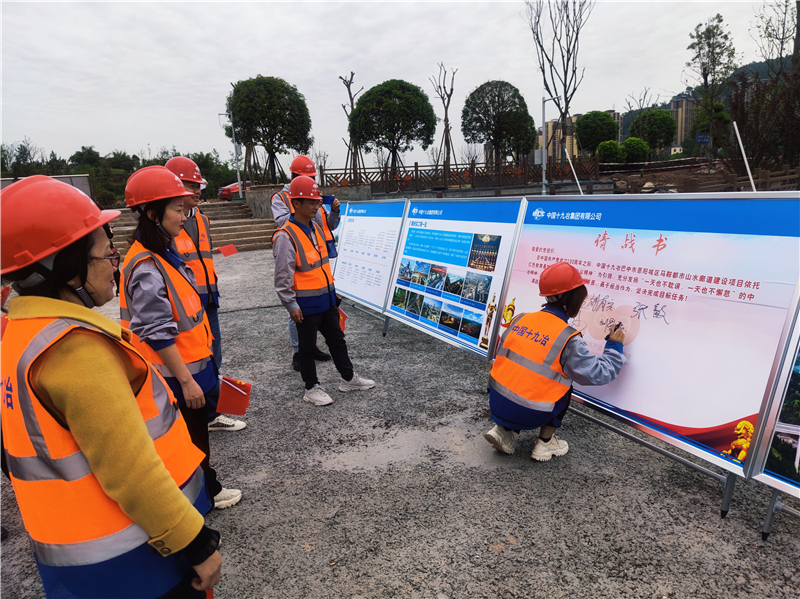 在办实事、开新局环节,项目部组织政府、业主、监理、设计等代表和媒体记者,实地参观了巴中山水廊道项目施工现场,展示项目建设的亮点和成果,详细介绍了项目区位、施工理念、管理模式、安全质量管理等情况,进一步展示了公司的标准化管理和良好品牌形象。在中心广场,项目全体员工在“请战书”上签字,为坚决完成目标任务立下铮铮誓言。