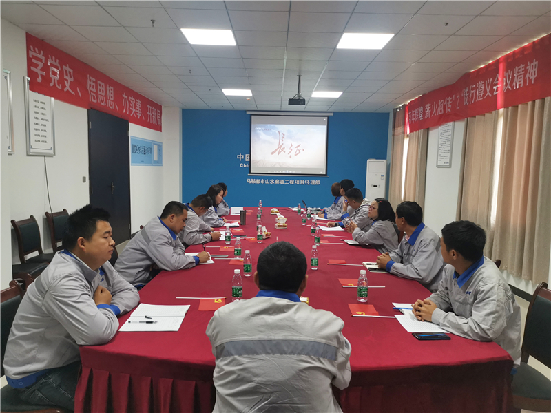 在学党史、悟思想环节,与会人员观看了《中国共产党百年述职报告》党史教育纪录片和《长征》记录片第三集《伟大转折》,深入了解中国共产党百年历程中的精神内核和中国十九冶55年的发展历史,并围绕遵义会议精神主题开展党史知识抢答活动,扎实推进党史学习教育开展。紧接着,巴中山水廊道项目负责人讲授《走好新长征路 建设人民满意工程》主题党课,声情并茂地讲述了那些年发生在巴中革命老区的红色革命历史故事,讲述了巴中山水廊道项目如何通过践行遵义会议精神,发扬央企社会责任,发挥党支部战斗堡垒作用,传递红色正能量,奉献精品工程,让遵义会议精神在新时代绽放更加耀眼的光芒。活动中,项目全体党员在鲜艳的党旗下重温入党誓词并郑重承诺坚定共产主义理想信念,追忆革命先辈奋斗历程,重温党的光辉历程,歌颂党的伟大成就,继承和发扬党的光荣传统和优良作风。随后,全体人员齐唱红歌《唱支山歌给党听》,追忆那段艰苦卓绝而又充满必胜信念的光辉岁月,讴歌红军战士不怕牺牲、百折不挠的英雄品格,旨在号召广大党员以更高的责任、更大的力度、更实的举措,弘扬传承遵义会议精神,在两个一百年交汇的伟大时刻,继续不忘初心、牢记使命,明身份、亮行动、有作为,激发工作干劲,充分展现中国十九冶赓续红色精神、传承红色血脉、服务当地社会、建设人民满意工程的决心和信心。