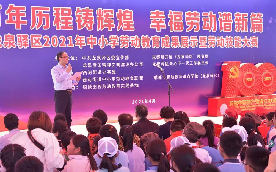 4月29日,“百年历程铸辉煌·幸福劳动谱新篇”龙泉驿区2021年中小学劳动教育成果展示暨劳动技能大赛在校外劳动教育实践基地锦绣田园隆重举行,本次活动由中共龙泉驿区区委宣传部、龙泉驿区教育局、龙泉驿区精神文明建设办公室、龙泉驿区关心下一代工作委员会、西河街道办事处联合主办。成都市委教育工委委员、市教育局党组成员、成都市人民政府总督学陈蕾,龙泉驿区区委宣传部、区文明办、区关工委、区党史学习办、西河街道相关领导和全区中小学校长、学校责任督学、企业代表、劳动教育教研员、“劳动小达人”、参赛学生近400人参加活动。龙泉驿区教育局党组成员、副局长张英武主持活动。