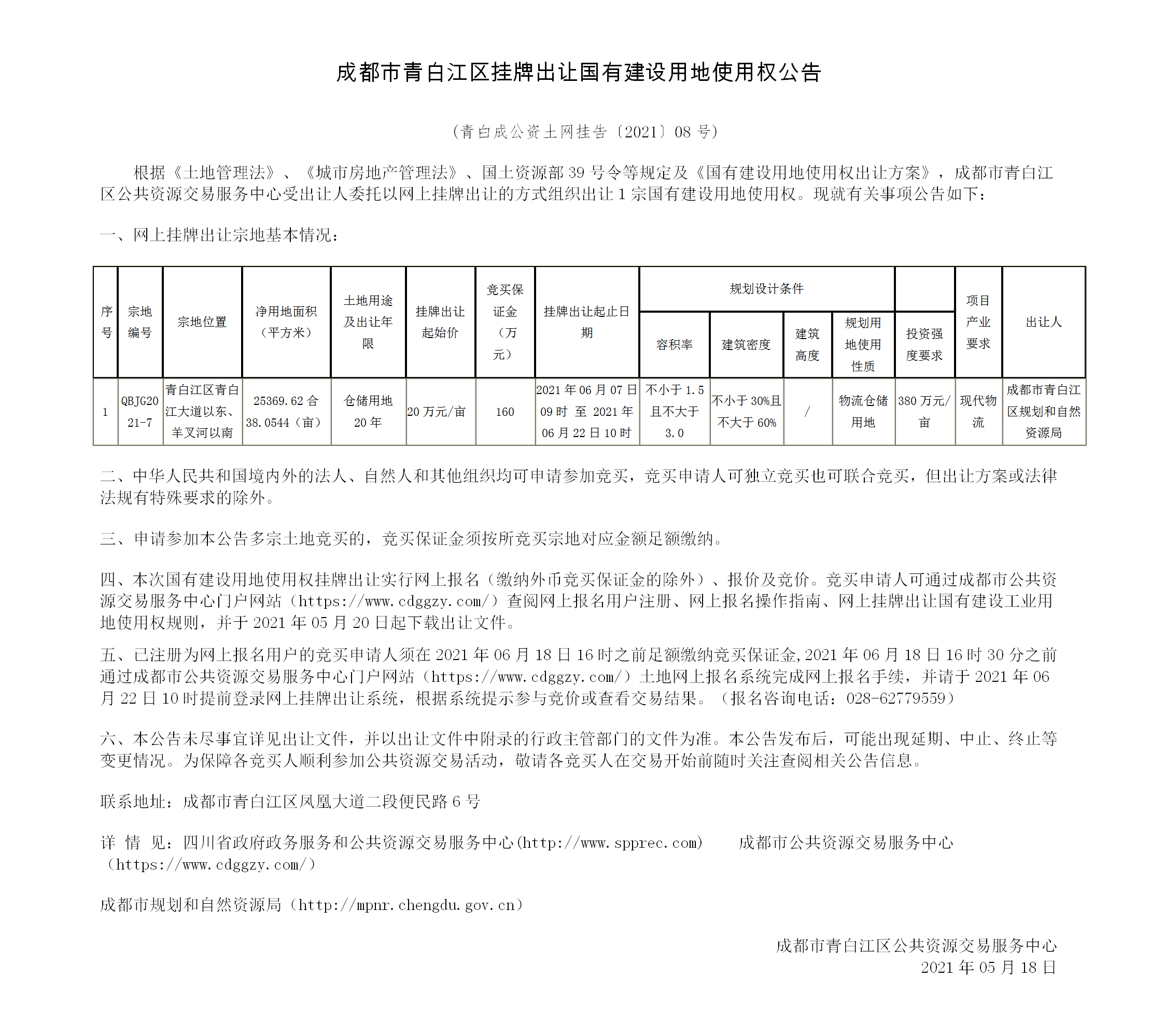成都市青白江区挂牌出让国有建设用地使用权公告(青白成公资土网挂告〔2021〕08号)