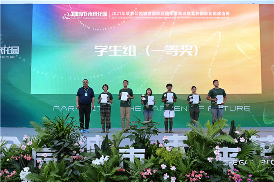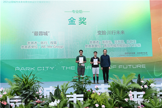经过评比,共有学生组优秀奖8组、银奖5组、金奖1组、大奖1组和专业组银奖3名、金奖2组等奖项在2021公园城市未来场景创意设计大赛中诞生。现场嘉宾为获奖者颁奖。