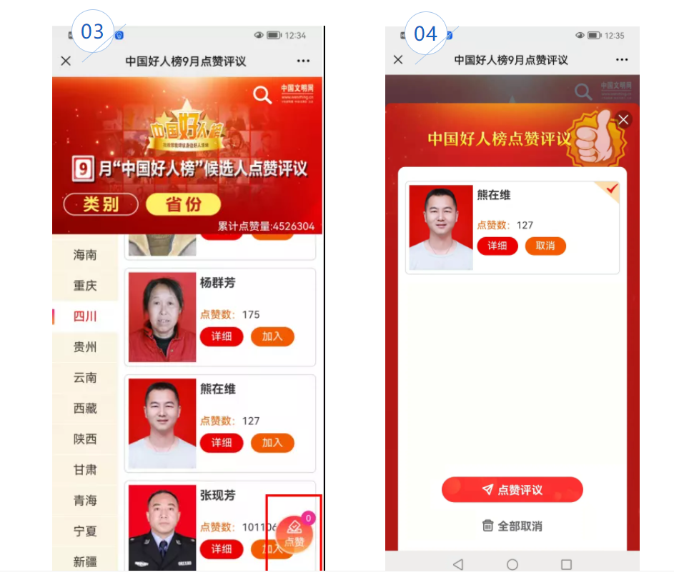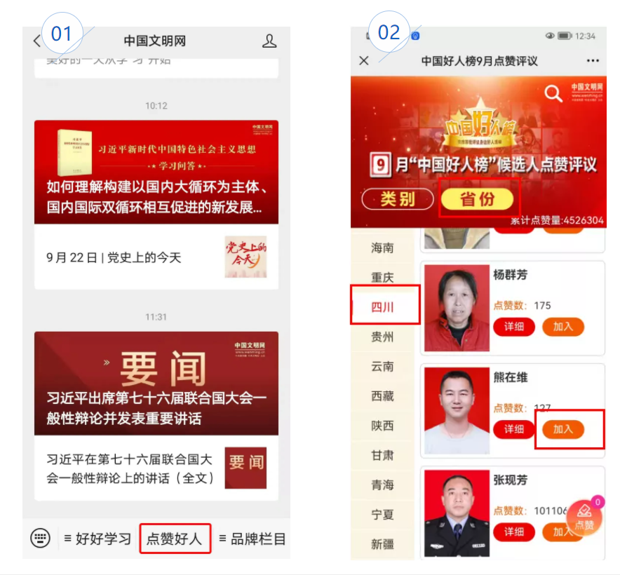 点击菜单栏的“点赞好人”,进入点赞页面。点击“省份”,选择“四川”,找到“熊在维”,点击“加入”。