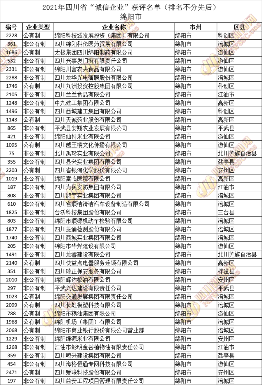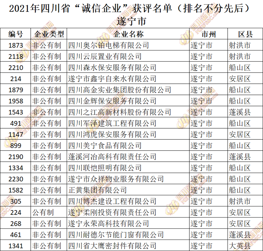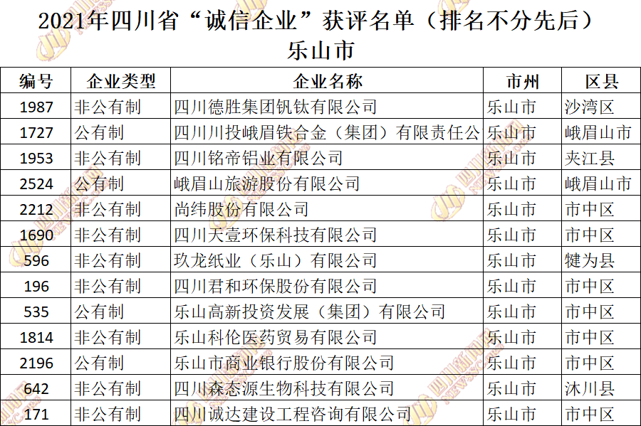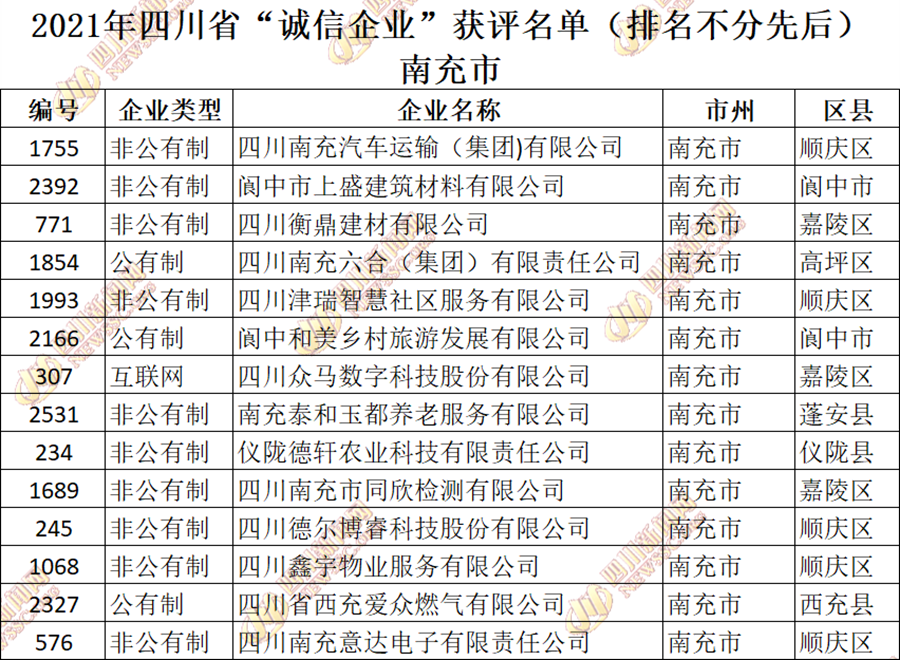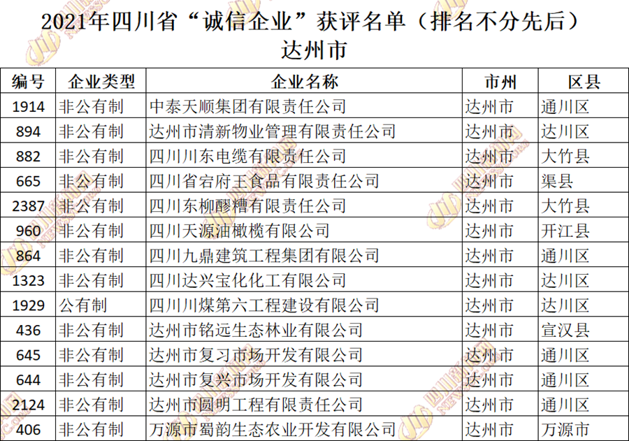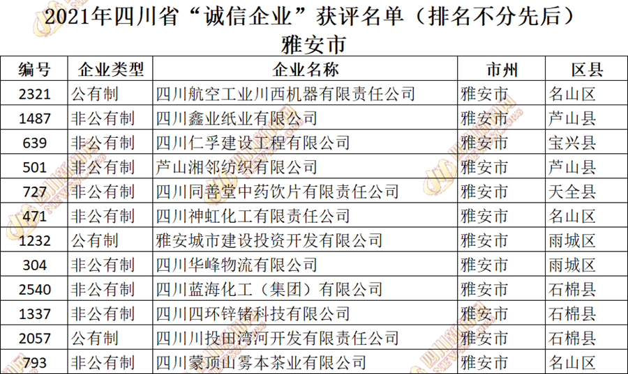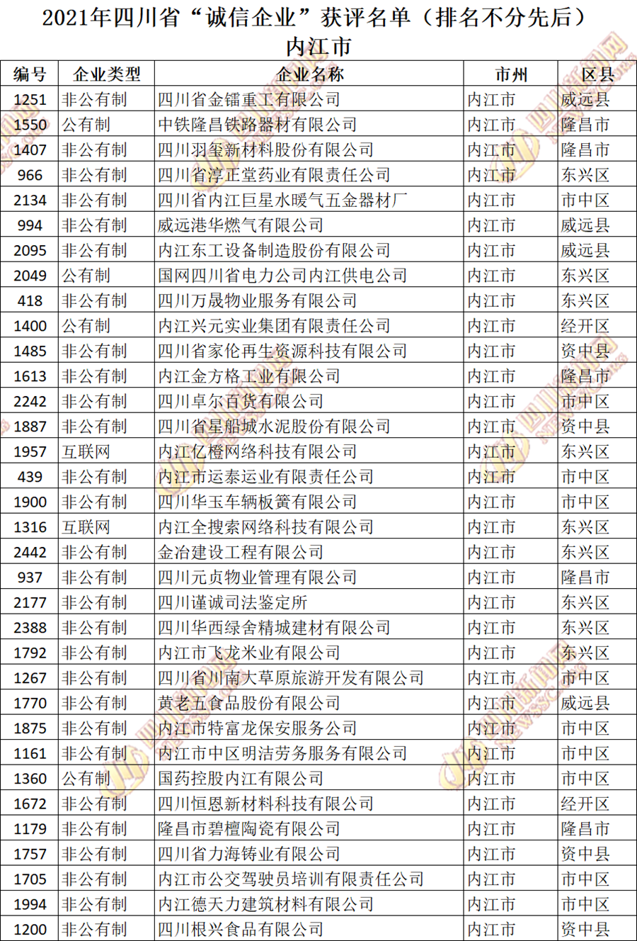 获评2021年四川省“诚信企业”名单公布如下: