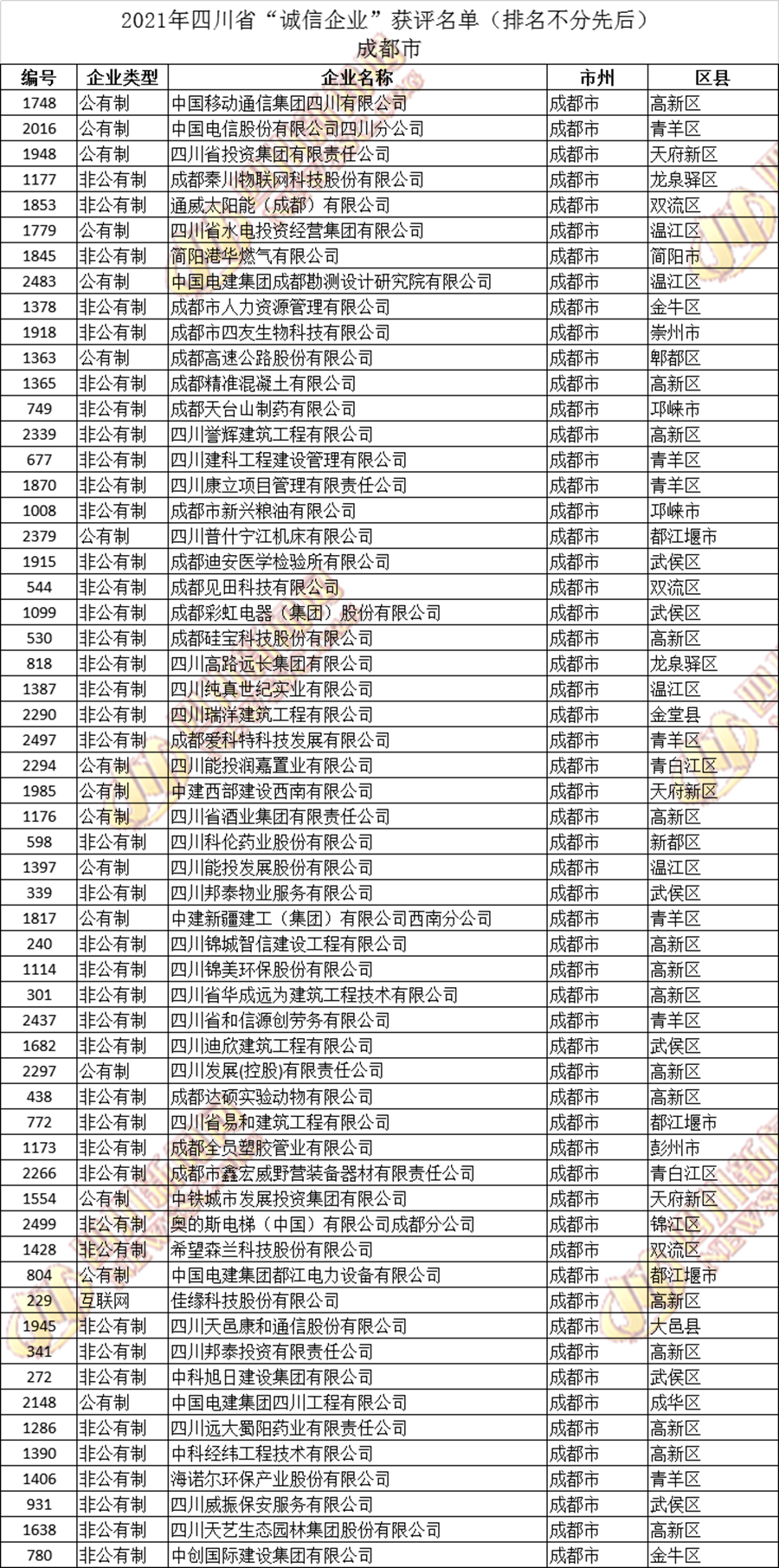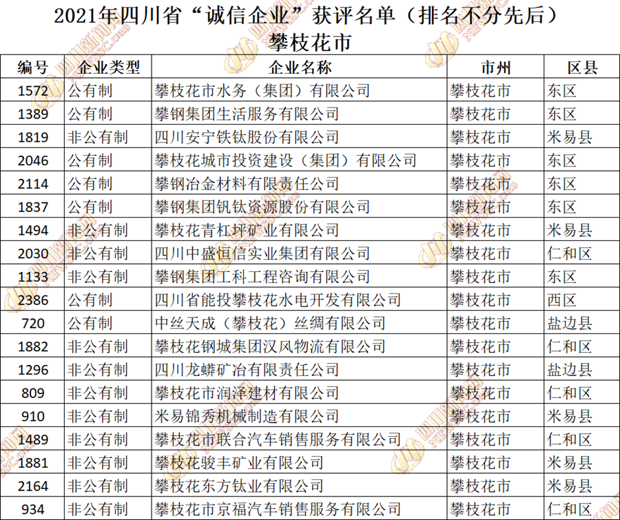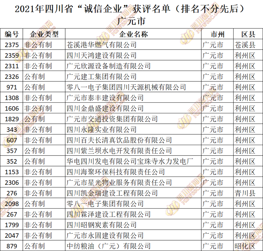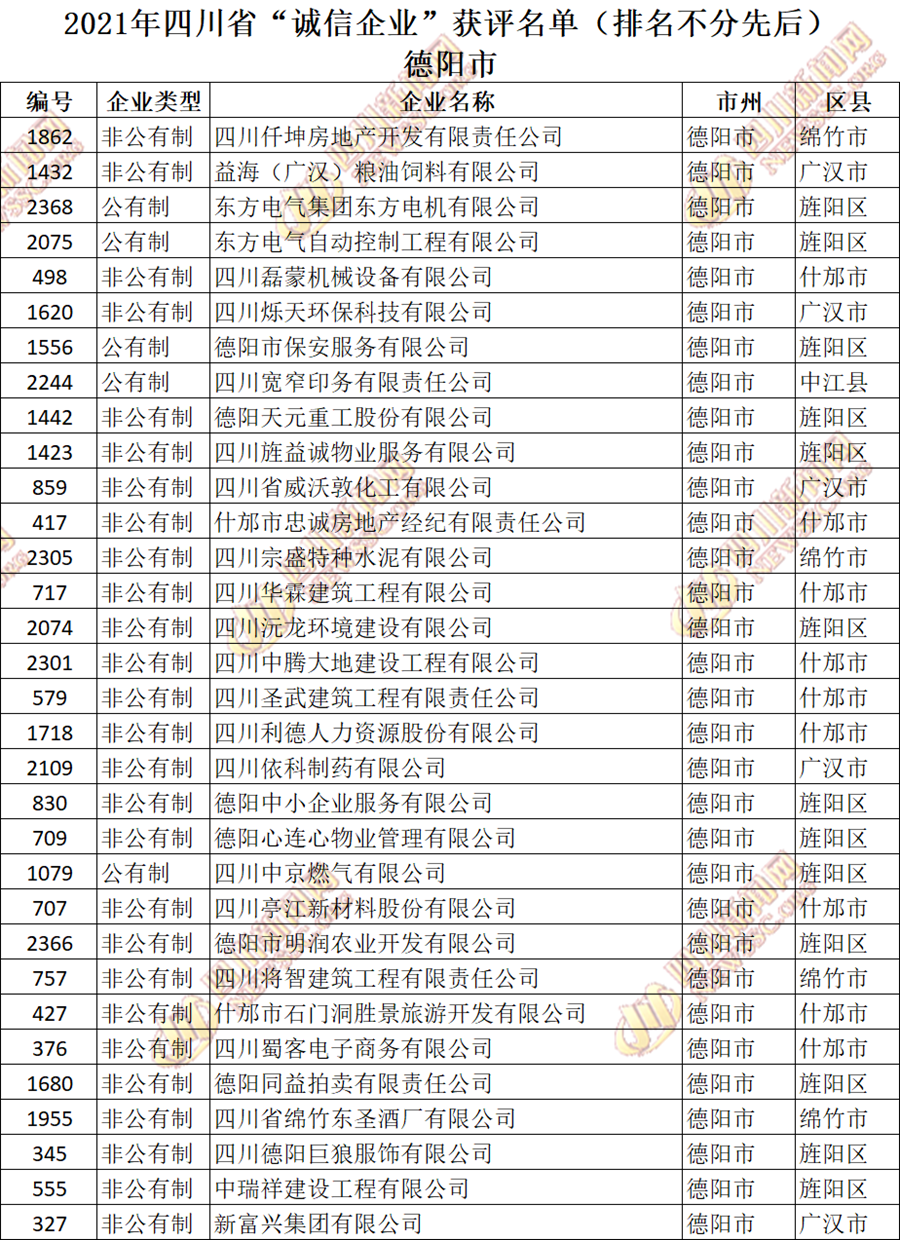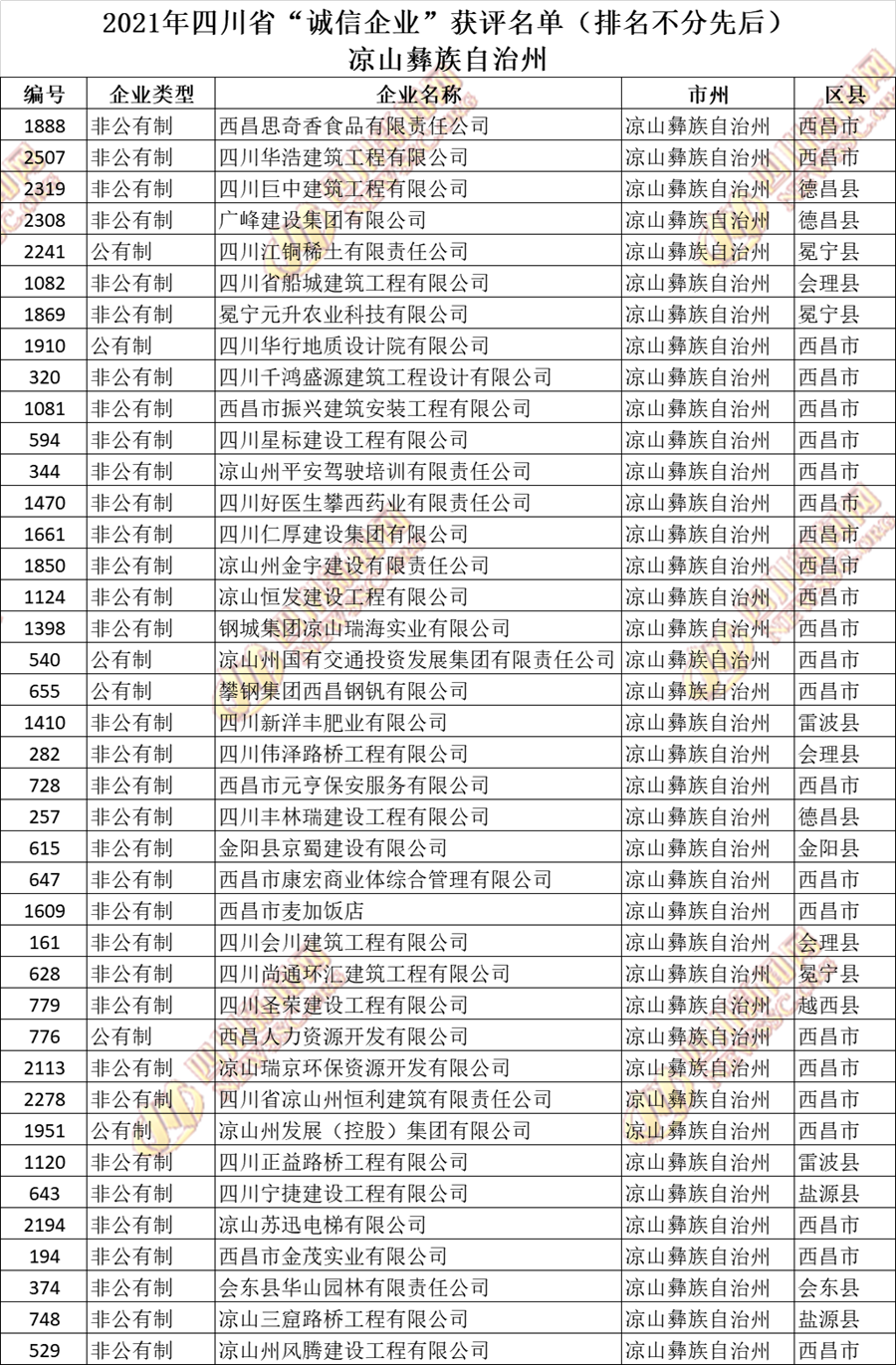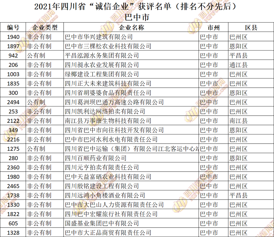 获评2021年四川省“诚信企业”名单公布如下: