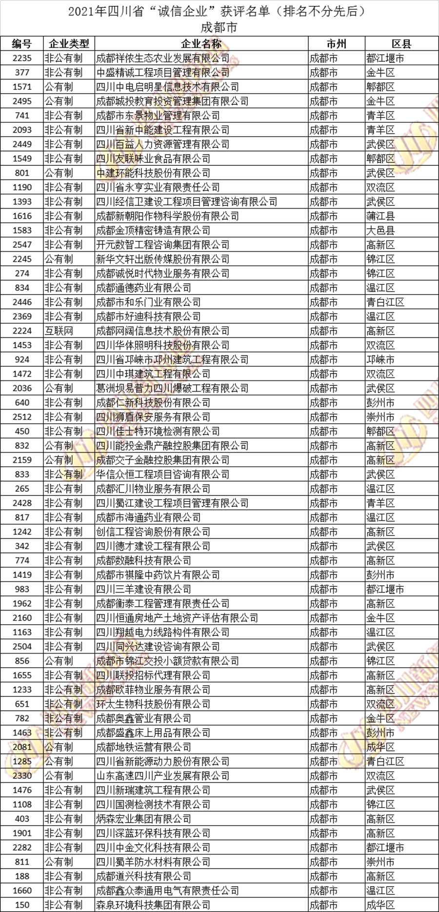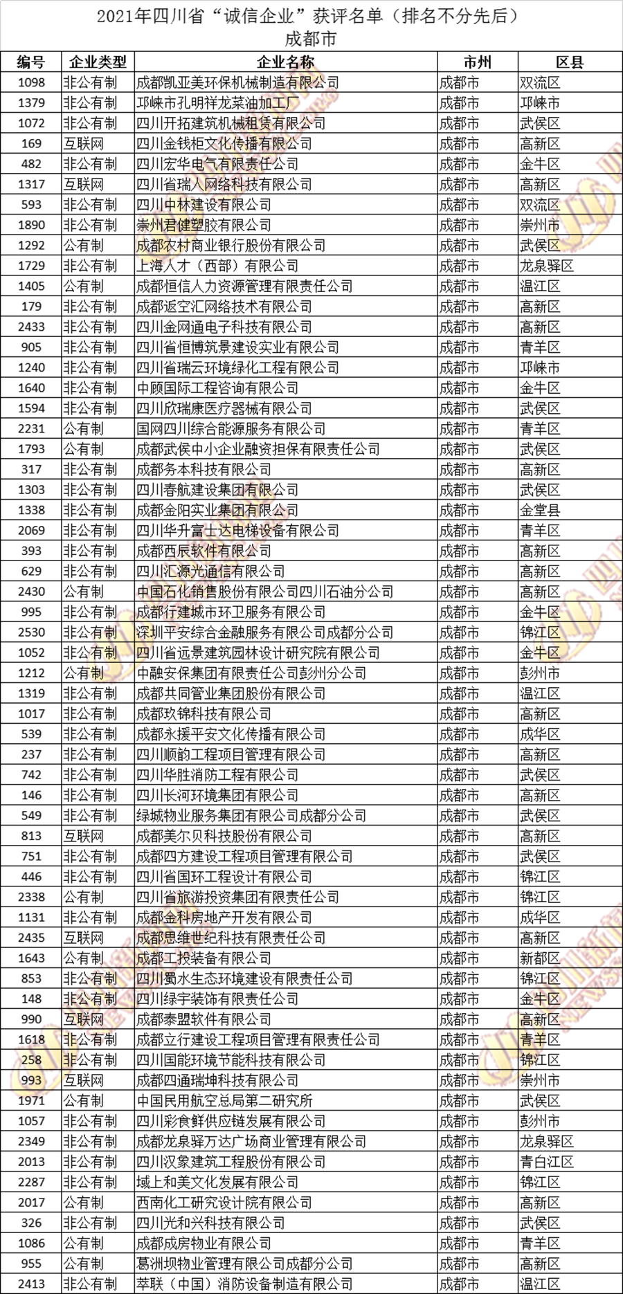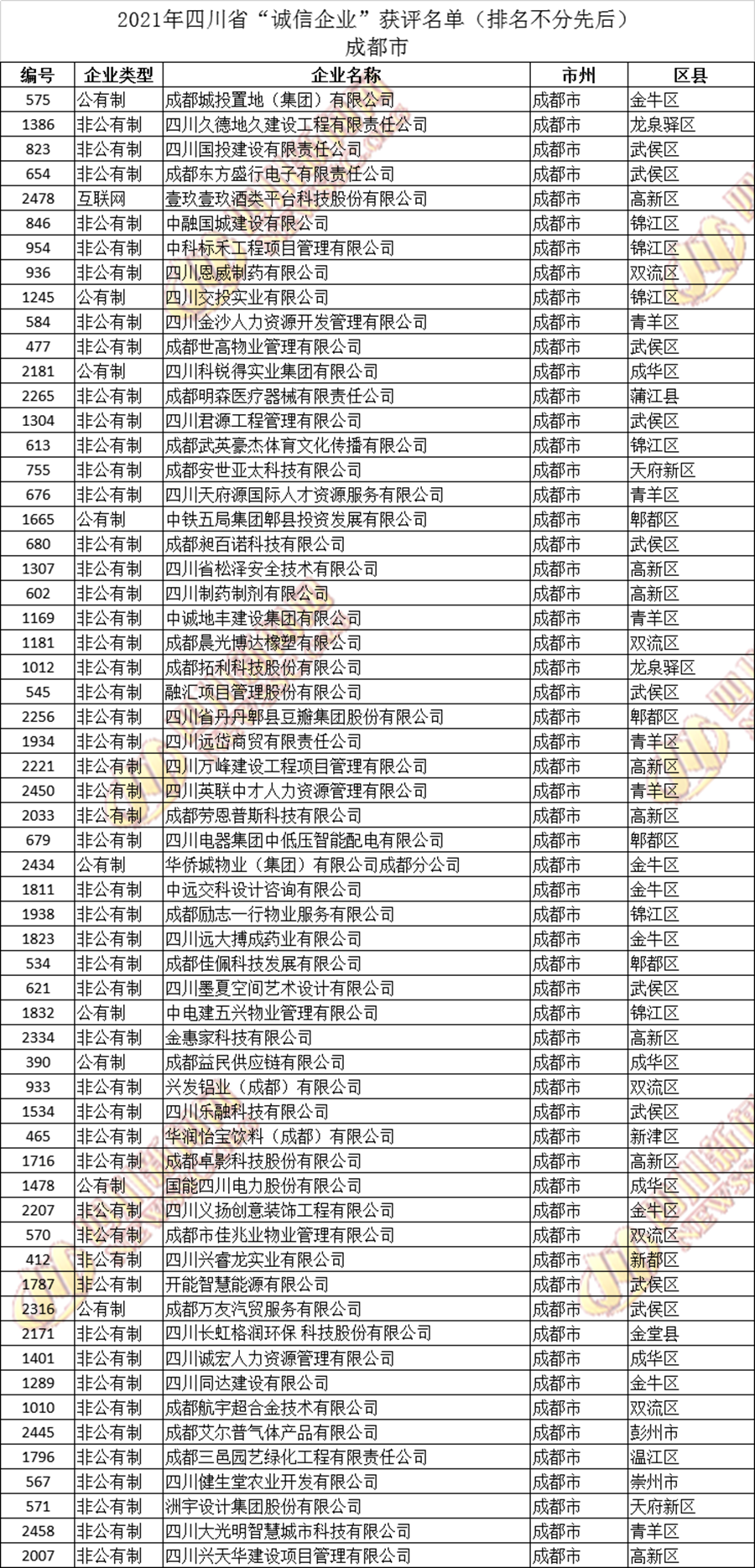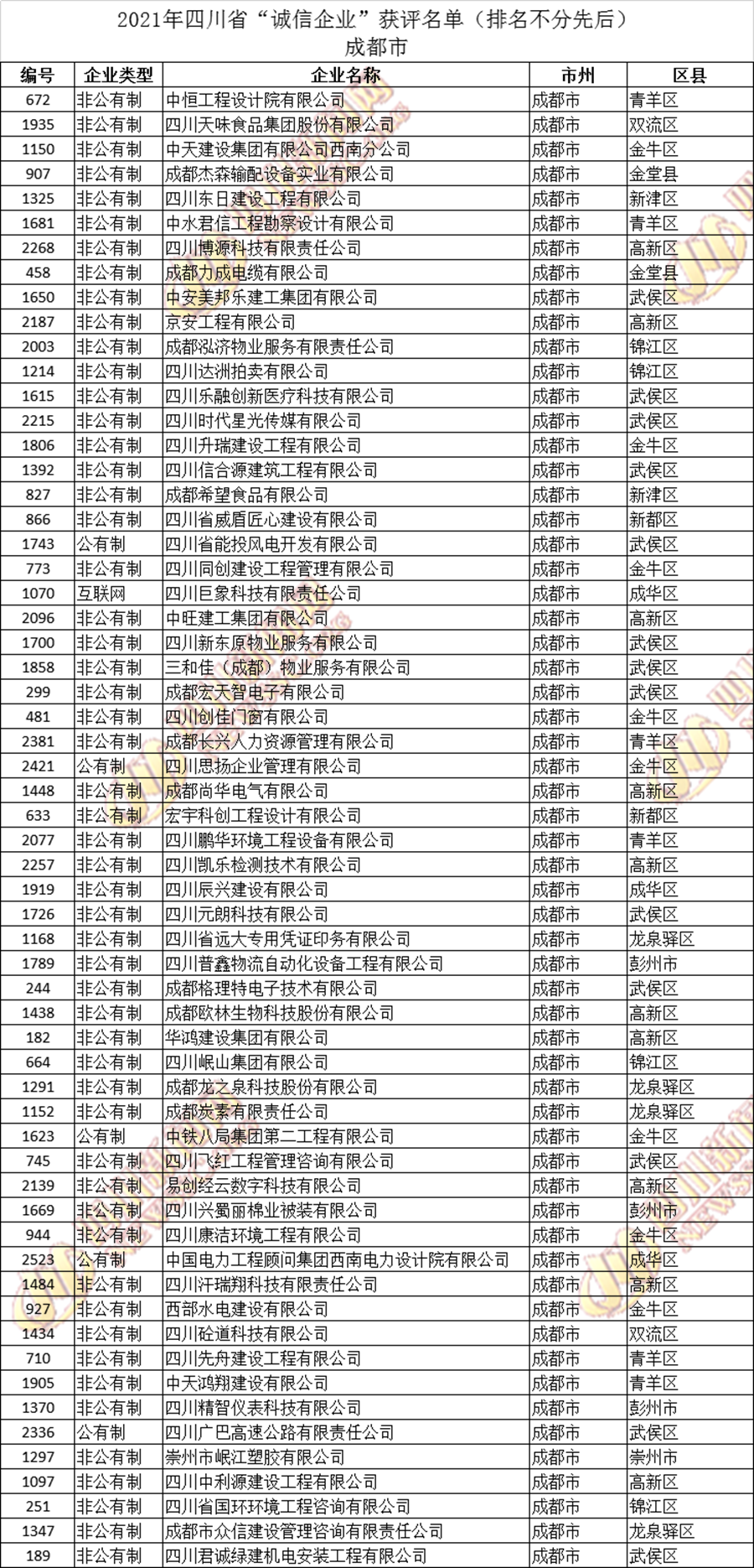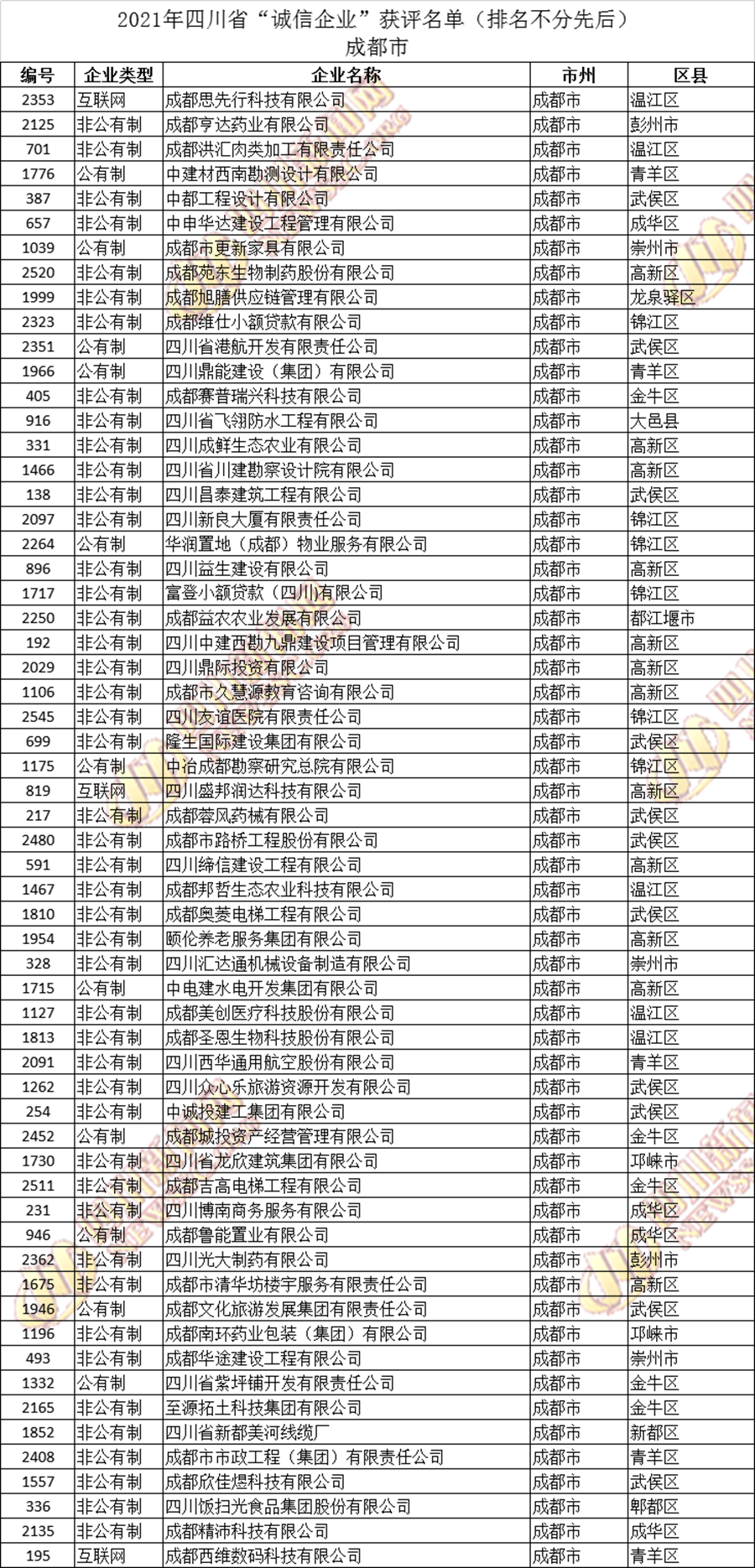 获评2021年四川省“诚信企业”名单公布如下: