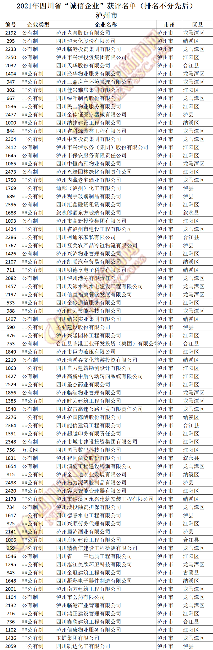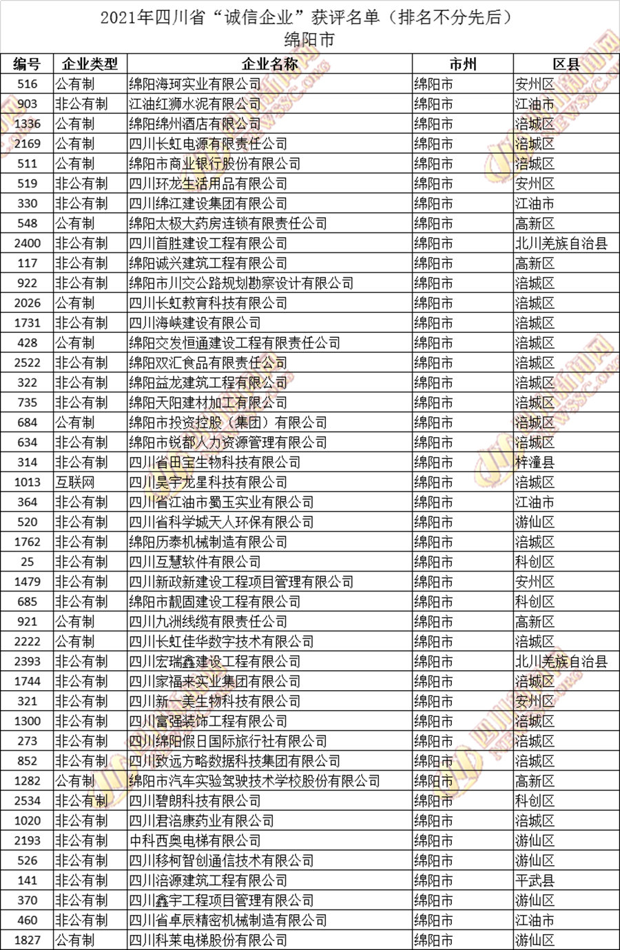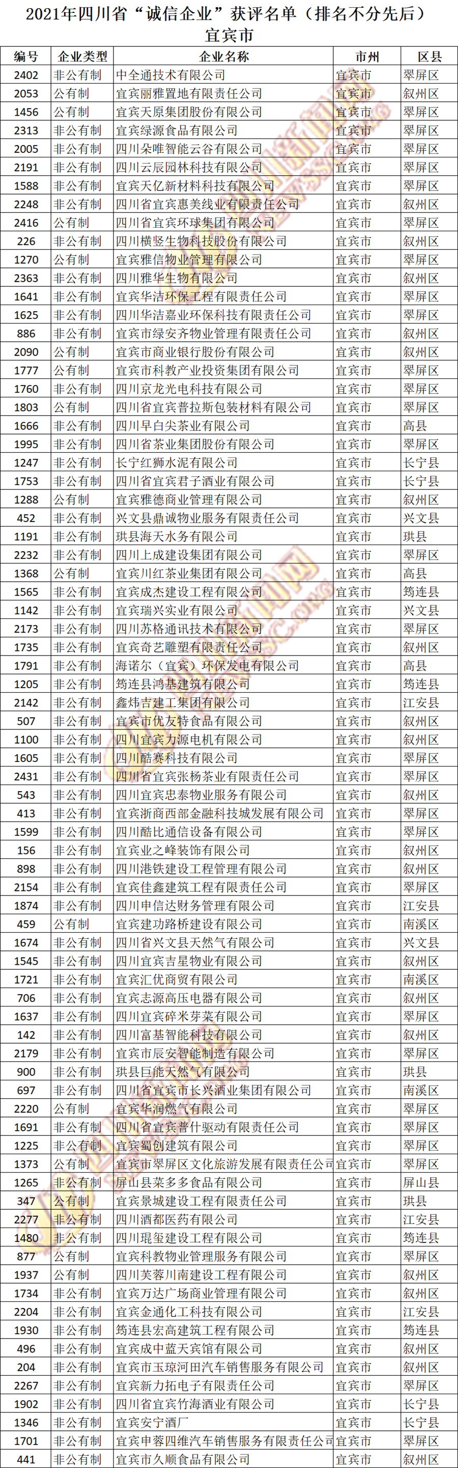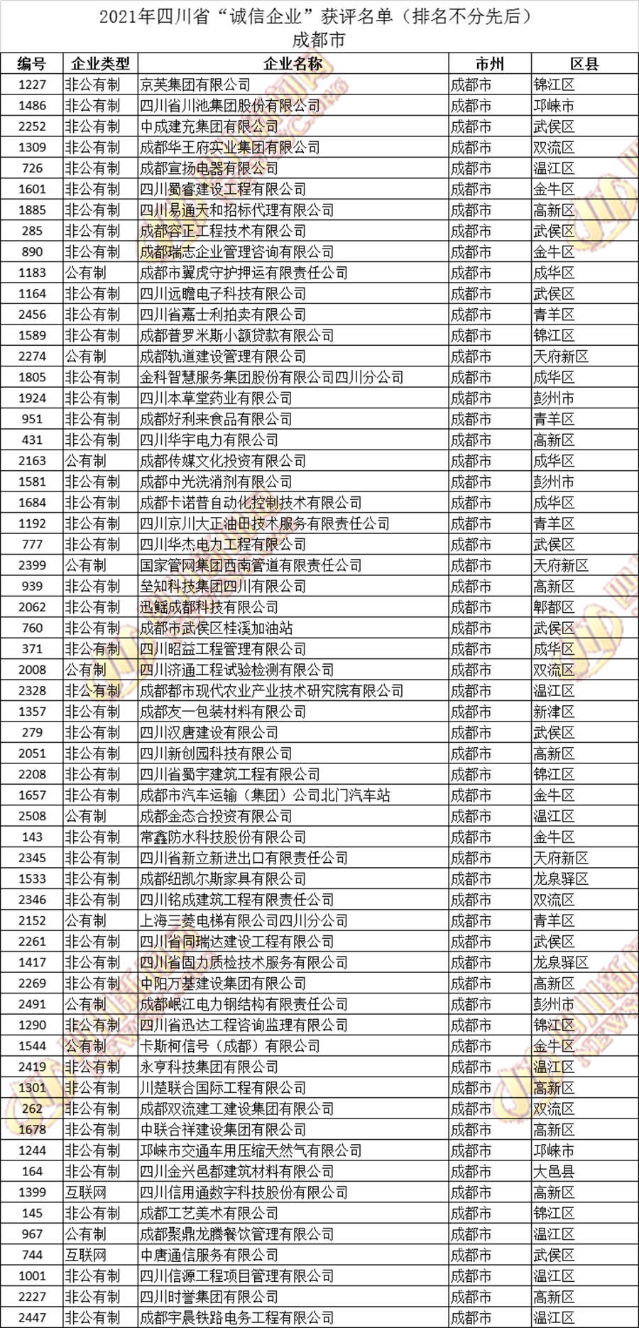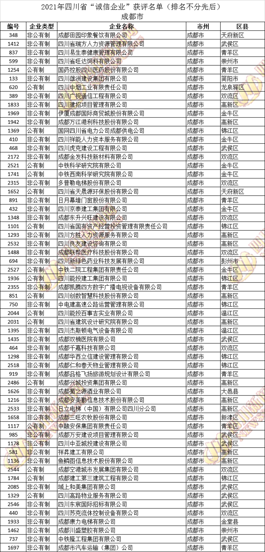 获评2021年四川省“诚信企业”名单公布如下: