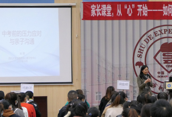 四川新闻网成都10月20日讯(罗颖林 刘颖) 继9月17日“如何与青春期孩子积极、正确的沟通”讲座受到了家长们的一致好评,10月18日,青羊区心理健康教育中心“家长课堂,从‘心’开始”系列讲座,再次在成都市树德实验中学清波校区开展,本次讲座继续邀请了华西医院坐诊医生、心身障碍病区组长、四川省医师协会精神科分会秘书刘阳医生,她为学校9年级全体家长带来了“家长课堂,从‘心’开始——中考前的压力应对与亲子沟通”专题讲座,300余名学生家长聆听了本次报告。