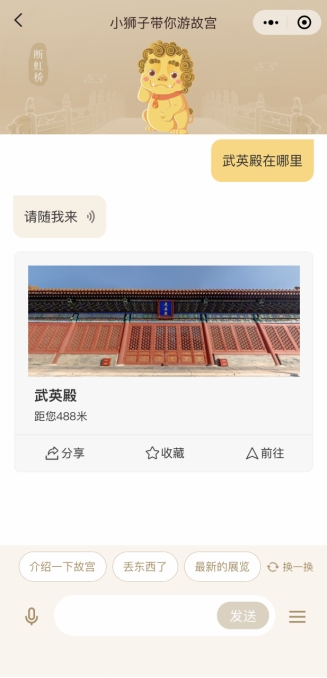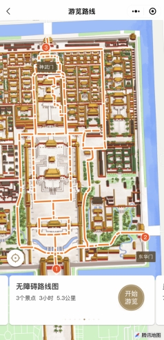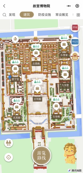 基于LBS(基于位置的服务)精确位置服务打造官方推荐路线导览,覆盖全院的精确路线规划让“寻路”不再困难。搭配官方语音讲解,一天、半天、三小时游览……无论观众是想“体验紫禁城的日常”还是“避暑”“赏秋”,都有相应的路线推荐。此次升级还首次在小程序这一载体中实现了AR实景导航功能。借助这一技术探索,观众可以在故宫内通过AR实景实时探路,解锁瑞兽三维模型,尝试更“立体”的参观体验。
