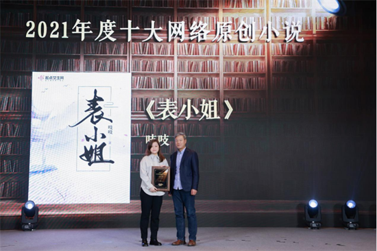 图说:《文艺报》总编辑梁鸿鹰(右)为 吱吱颁发“十大网络原创小说”奖项
