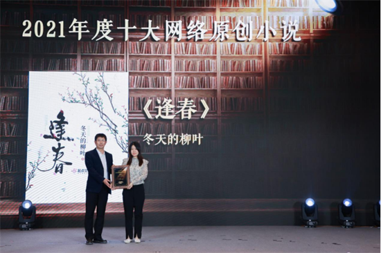 图说:中国现代文学馆副馆长梁飞(左)为冬天的柳叶颁发“十大网络原创小说”奖项