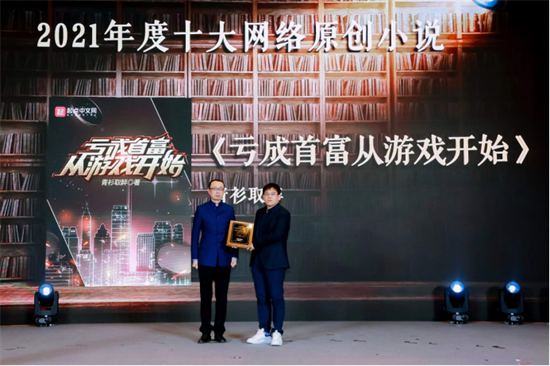 图说:中国社会科学院文学研究所数字信息室主任祝晓风(左)为青衫取醉颁发“十大网络原创小说”奖项