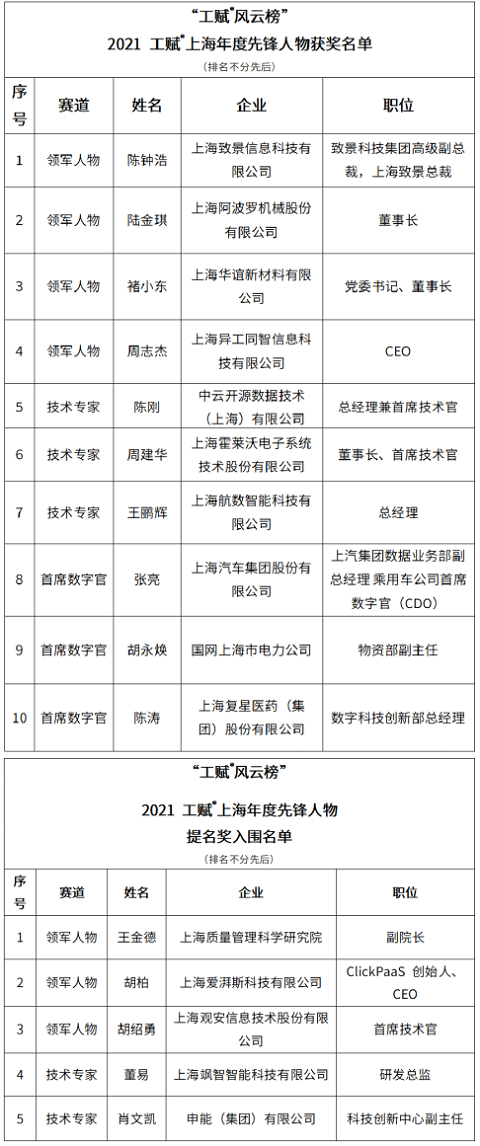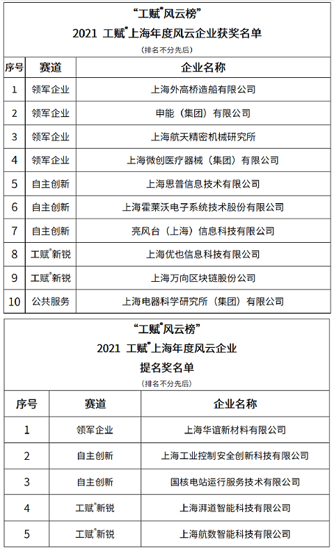 历经三个月的社会征集、初审、专家复审、路演决赛和结果公示,“工赋®风云榜”工赋®上海2021年度评选圆满落幕。10家风云企业代表、10位先锋个人代表正式出炉,他们代表了2021年上海工业互联网建设、经济数字化推进最前沿、最具影响力的成果。 一年一度的“工赋®风云榜”评选,是上海推进工业互联网创新发展、促进经济数字化转型的重要部署,对全力打造上海工业互联网 2.0升级版,全面打响“工赋®上海”品牌,发挥了重要的标杆引领和示范作用。“工赋®风云榜”旨在分享工业互联网经验成果,构建更加开放、合作、交流、学习的产业发展生态,实现工业化与信息化在更广范围、更深程度、更高水平上融合发展。 2021年 “工赋®风云榜”年度评选活动,由上海市经济和信息化委员会、工业互联网产业联盟指导,上海市工业互联网协会和人民网上海频道共同主办。活动一经发布便获得广泛关注,一个月内收到百余家优秀工业互联网企业和个人的申报材料。经上海市工业互联网协会组织的初审、专家复审和决赛路演,最终,10家风云企业、10位先锋人物在激烈竞争中脱颖而出,荣登榜单,具体名单如下: