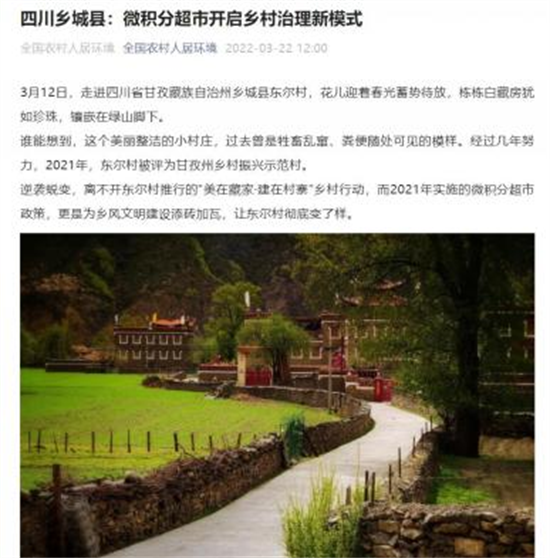 四川新闻网-首屏新闻成都4月22日讯 阳春三月,万物复苏。在甘孜州乡城县东尔村,栋栋白藏房犹如珍珠般镶嵌在雪山脚下。在这里,家家户户的房前屋后都收拾得干干净净,小溪清澈见底,路边星星点点的野花绽放。老年活动中心里,慈祥的阿么阿尼骄傲地说“咱们村美吧,这都是乡风文明积分超市的功劳!”。