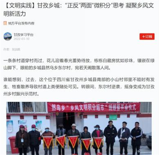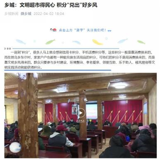 “积分超市”激发了乡村文明新活力,受到了各方关注。3月10日,《学习强国》甘孜学习平台以《甘孜乡城:“正反”两面“微积分”思考 凝聚乡风文明新活力》为题进行了详细报道;3月22日,《农民日报社》主办的“全国农村人居环境”微信公众号以《四川乡城县:微积分超市开启乡村治理新模式》为题,对“超市”进行了点赞;乡城县融媒体把东尔村的“超市”兑换现场搬上了电视银屏,在全县进行宣传报道。