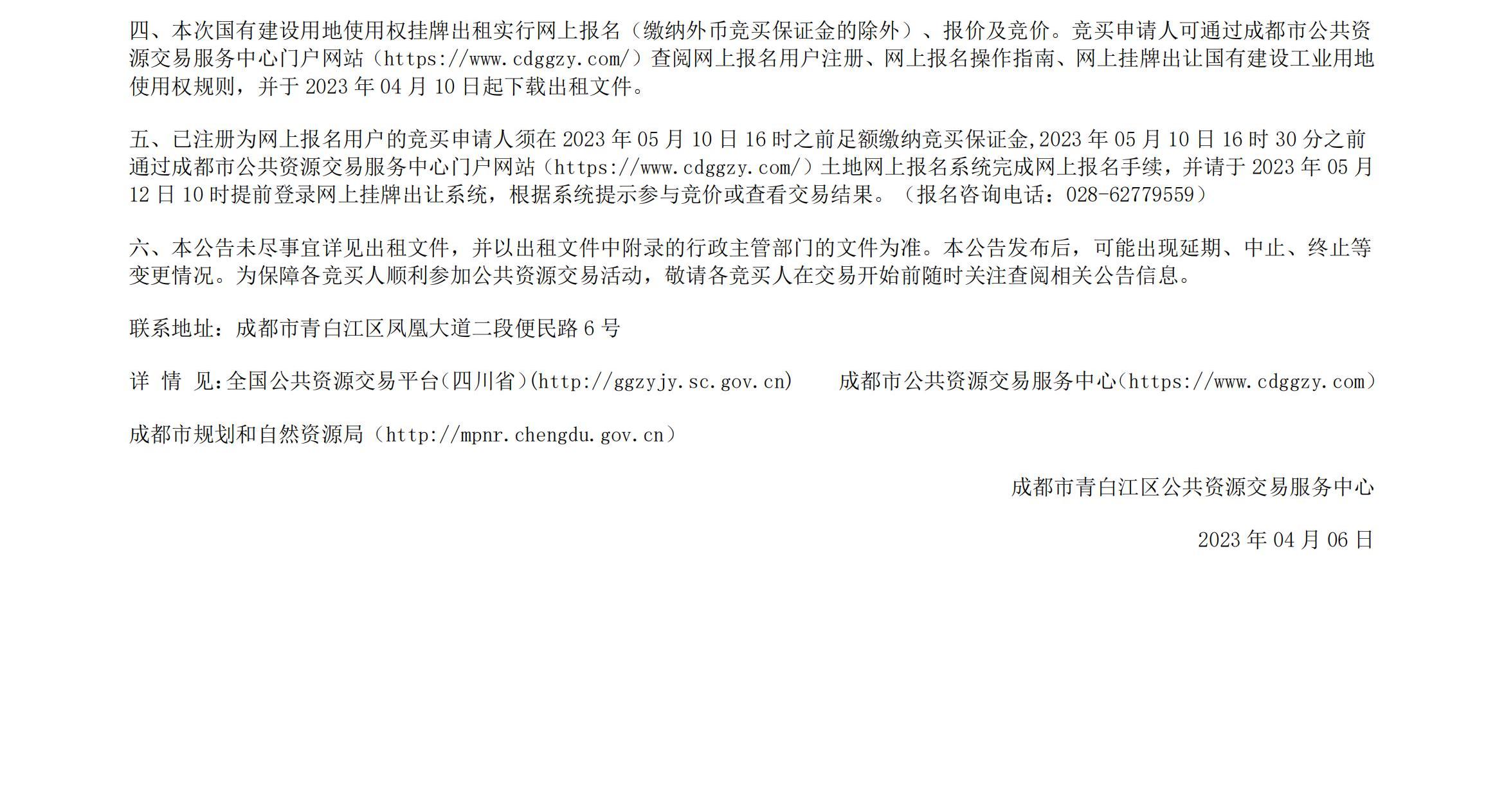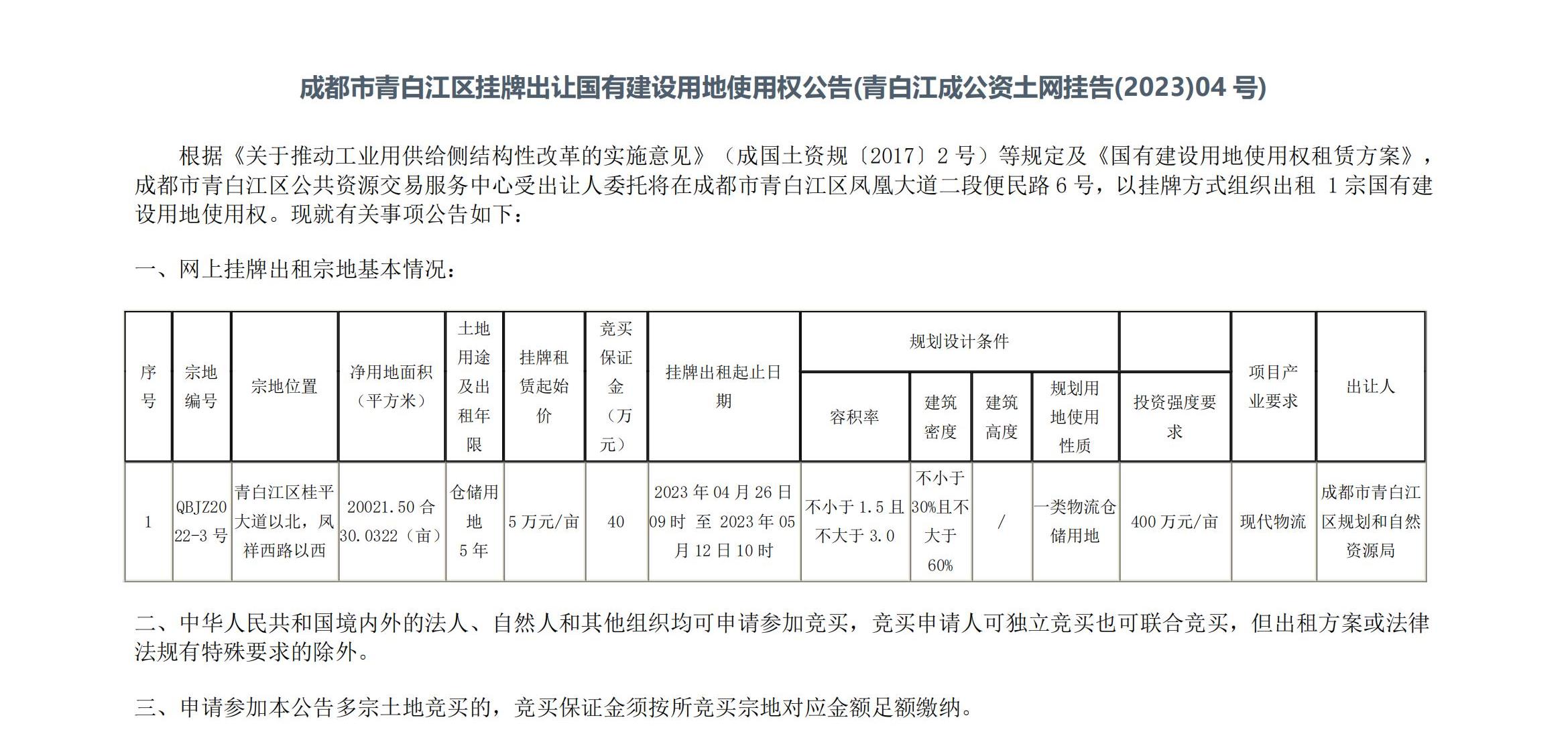 成都市青白江区挂牌出让国有建设用地使用权公告(青白江成公资土网挂告(2023)04号)