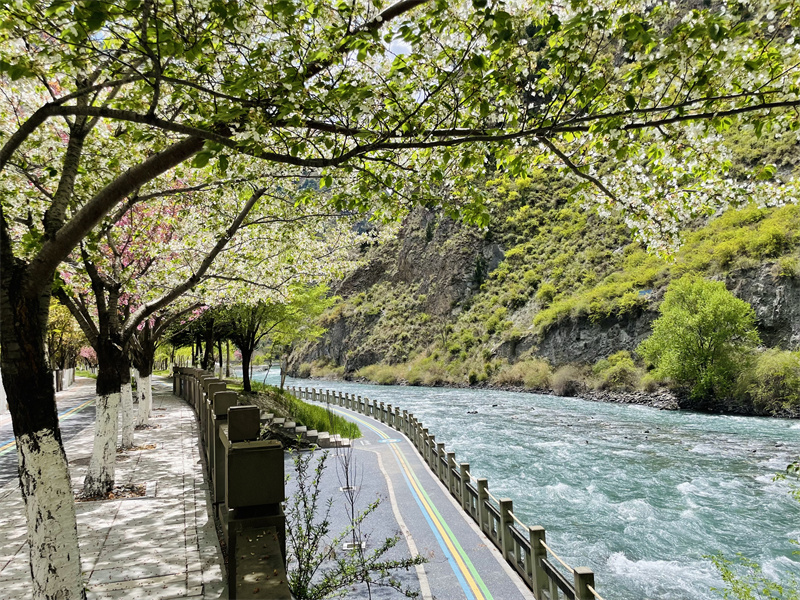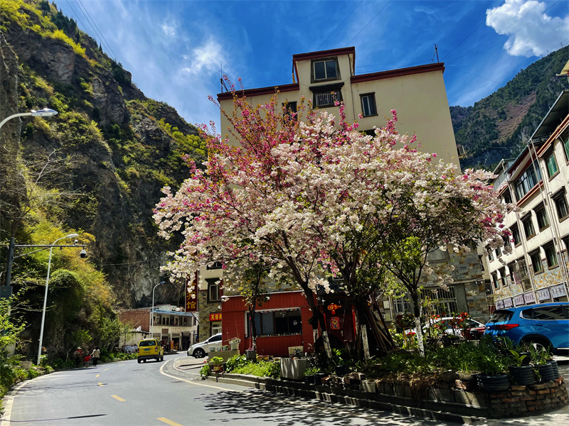在理县各个街道、村道,随处可见盛开的粉、白色樱花,气味芳香,清丽宜人,美不胜收。一朵朵樱花,层层叠叠,在春风中醒来,舒展开柔美的花瓣,凝露而绽,迎风而舞,一团团、一簇簇千娇百媚的樱花形成一整片红粉白相间的花海,绽放出它独有的光彩,吸引市民观花赏景,感受早春的气息。(图由理县县委宣传部提供)