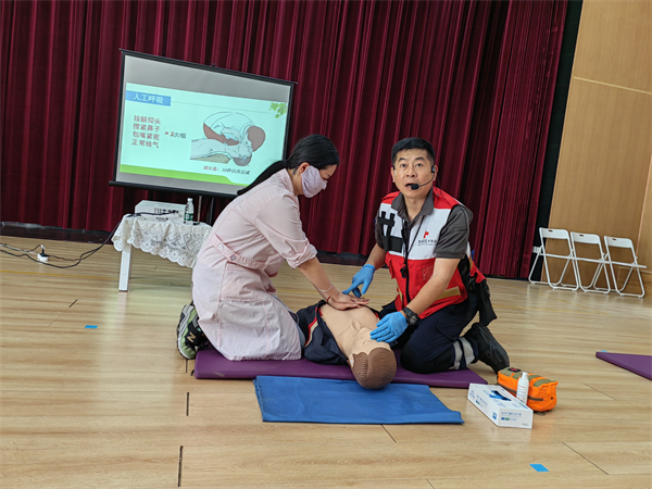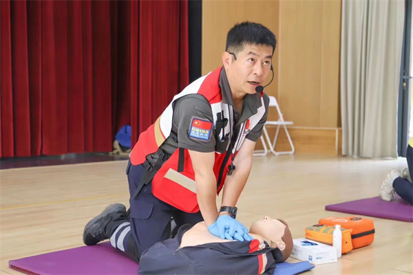 此次活动特邀四川省红十字会救护师、中国应急救援队队员、TCPP军事急救教练员李峻虎老师进行现场指导。围绕院前急救培训,李老师向大家讲解了急救的情景与判断标准,并详细示范施救流程,介绍心肺复苏、人工呼吸与AED的使用方法,重点讲解了心肺复苏的按压位置、按压深度与按压频率。此外,通过情景模拟,教会大家在遇到紧急情况时,利用黄金4分钟进行有效施救。针对幼儿园的特殊情况,李老师重点向大家讲解了气道梗阻伤害 ——海姆立克急救法,通过“剪刀石头布”口诀教大家如何找准位置,掌握力度,正确使用海姆立克急救法进行特殊急救。丰富的肢体语言和幽默风趣语言描述将大家沉浸式带入到急救情景中,让老师们在参与过程中学会正确的急救知识。