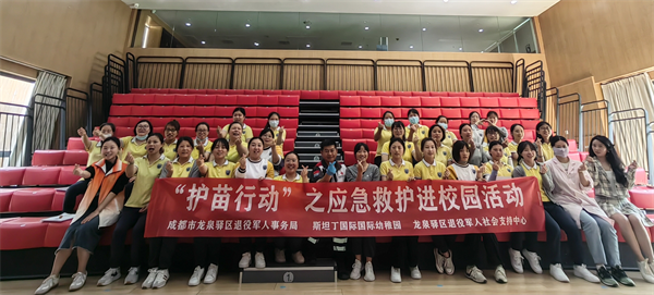 四川新闻网-首屏新闻成都4月17日讯 为增强辖区学校教师和家长们面对突发事件、意外伤害的应急意识,普及应急救护基本知识,同时搭建退役军人才能发挥平台,2023年4月14日,龙泉驿区退役军人社会支持中心联合接龙社区为斯坦丁国际幼稚园驿都园全体教师开展“护苗行动”之应急救护进校园活动,全校36名教师参与。