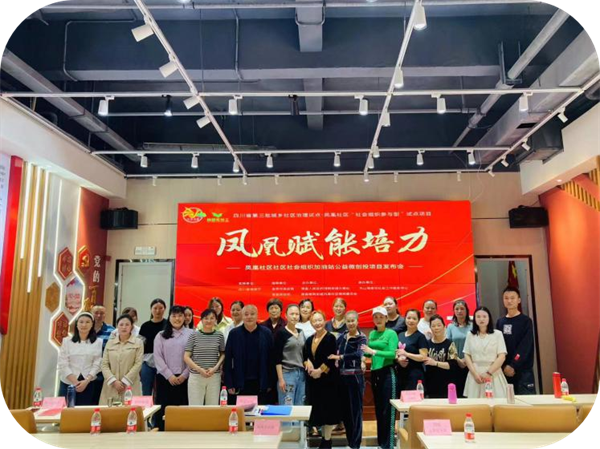 四川新闻网-首屏新闻成都4月17日讯 为深入学习贯彻党的二十大精神和省委十二届二次全会精神,认真贯彻落实习近平总书记关于城乡基层治理工作的重要指示精神,推进凤凰社区社区社会组织服务体系和人才队伍建设提质增效,推动“五社联动”助力基层深耕善治,4月13日下午,由荣县人民政府梧桐街道、凤凰社区主办,乐山海棠花社会工作服务中心承办的凤凰社区“凤凰赋能培力”社会组织加油站公益微创投项目试点发布会暨项目签约仪式在凤凰社区邻里会客厅正式启动。