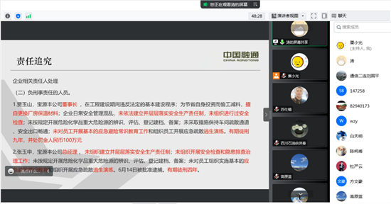 本次培训采取网络授课方式,共计8个学时,内容主要包括明确企业安全生产主体责任、解析安全生产相关法律法规、分析消防安全形势、剖析重大消防事故案例、明晰在营项目消防安全现状及管理要求,讲解电气安全技术、危险作业及特种作业安全要点等。