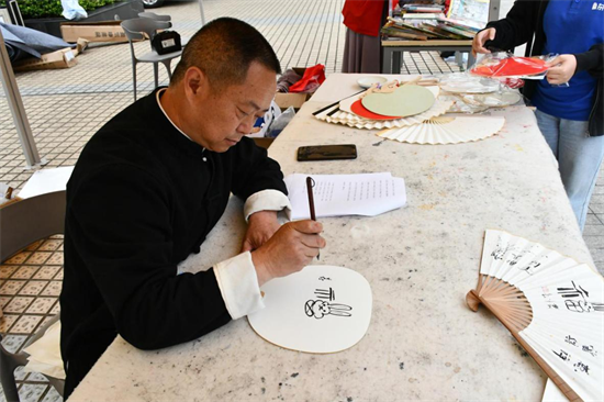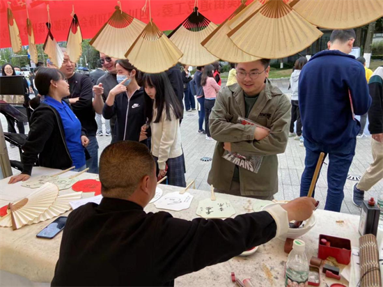 活动现场,领取到题字扇的职工又来到旁边的“笔底龙蛇,挥毫落纸”——题字作画坊,请专业的书法老师在扇面上题字作画。