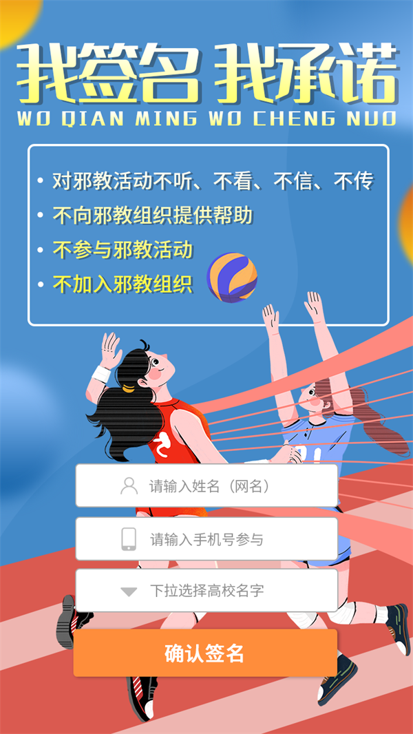 (二)在公众号下方的菜单中选择“签名活动”按钮,进入“青春飞扬迎大运·齐心反邪话平安”网上签名活动界面;