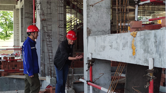 站在施工现场,梁晓龙指着现场用绿色密目网“围”住的楼栋介绍:“现在主要进行幕墙工程、二次结构及机电安装等施工。”随后,梁晓龙走进主体楼栋查看施工情况,时而用手拉一拉构造柱钢筋、用卷尺测量一下砖砌体马牙槎尺寸,时而比划一下消防喷淋系统安装情况、支吊架及喷头的间距……在施工楼栋内走走看看,他说:“每天都要来转几次心理才踏实,在抢工期的同时必须保障施工质量安全。”