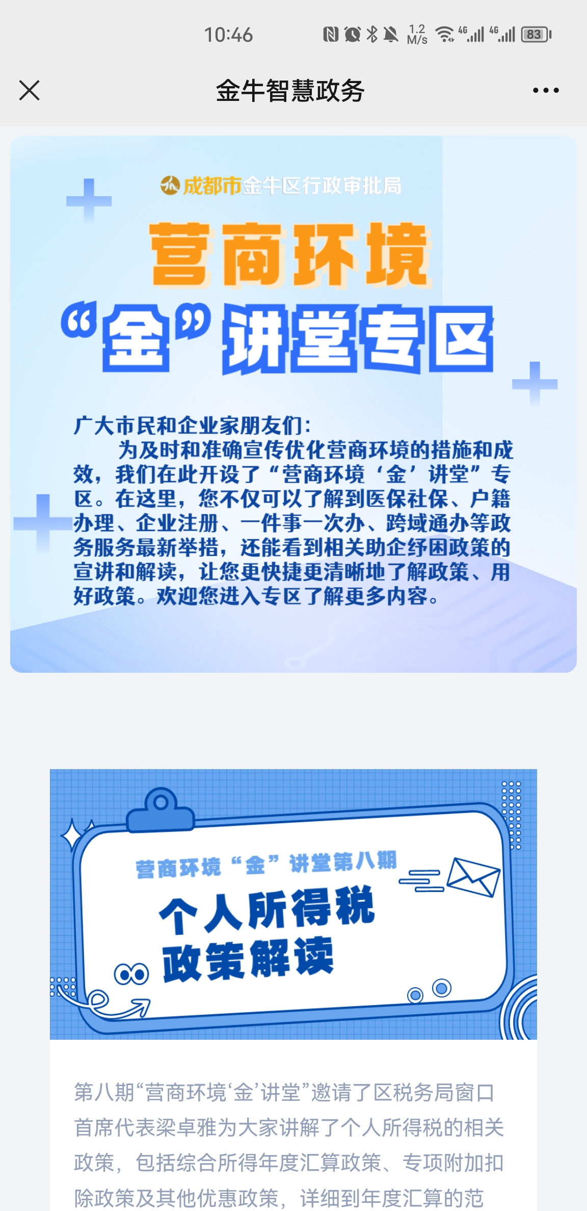 二、从“专业晦涩”到“浅显易懂”,建设政策发布的“宣传栏”。在“金牛服务”微信公众号上线“营商环境金讲堂”,已推出医保、社保、户籍办理、企业注册、一件事一次办、跨域通办等政策宣讲,后续将陆续推出企业、群众关注的助企纾困相关政策解读,让群众更快捷更清晰地了解政策、用好政策,弥补传统政务信息发布时效性上的不足。
