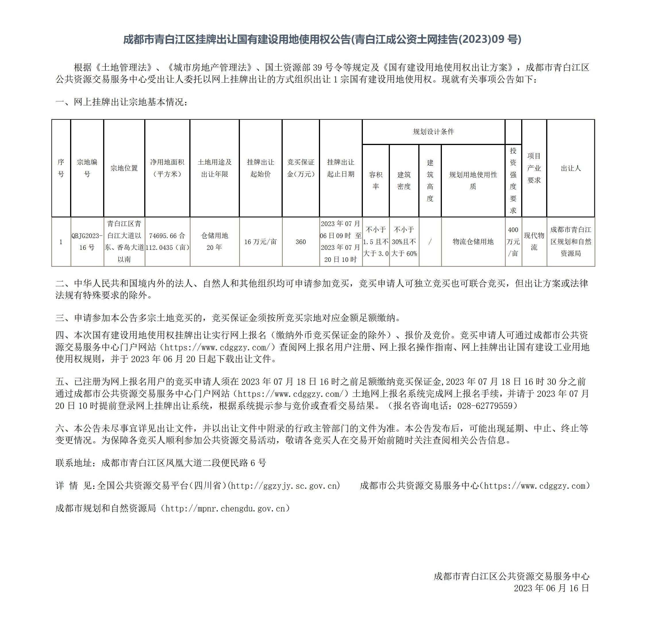 成都市青白江区挂牌出让国有建设用地使用权公告(青白江成公资土网挂告(2023)09号)