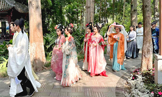 6月18日,临近端午传统佳节,成都祠堂街人头攒动,一场别开生面的国潮市集吸引了来往游客及汉服爱好者,唐、宋、明、近代等元素汉服巡游其间,除了窈窕淑女,杜甫、屈原等“NPC”也现身赶集。