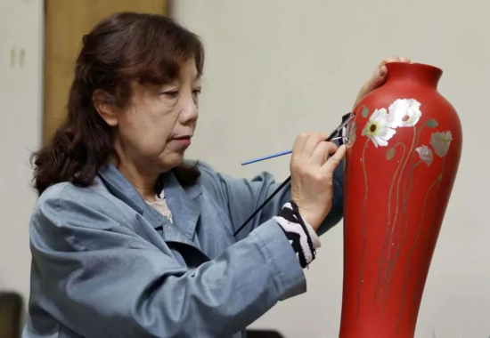 “我在20世纪80年代的时候,设计了这件高48厘米、直径16厘米的雕银丝光晕彩虞美人花瓶。花瓶的高矮,还有线条的流线,就像一个亭亭玉立的少女。1990年,这件花瓶做出来后,获得了中国漆器行业评比的4项满分,最后被收藏在中国工业美术馆珍宝馆。”尹利萍介绍。
