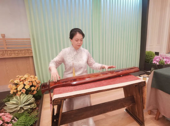 现场,魏玉平身穿灰白色中式盘扣竹纹传统服饰,修长而优雅的双手轻轻抚过琴弦,抚起了层层泛着涟漪的乐音。她演奏了《流水》《佩兰》《醉渔唱晚》《桃李园序》《孔子读易》等10余首蜀派古琴经典代表曲目,曲调深厚、灵透、柔和,音韵明亮、清脆、含蓄,潇洒飘逸,纯朴古雅,赢得了国际贵宾的连声叫好和点赞。