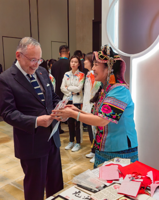 “这是中国的剪纸艺术,也是世界非物质文化遗产。”7月26日,在欢迎出席成都第31届世界大学生夏季运动会开幕式的国际贵宾的宴会开始前,蜀绣、棕编、糖画等四川非物质文化遗产项目的展示展演吸引了贵宾们的目光。在剪纸展示区,身着彝族服装的青羊区剪纸代表性传承人龙玲正向各国贵宾介绍剪纸艺术。