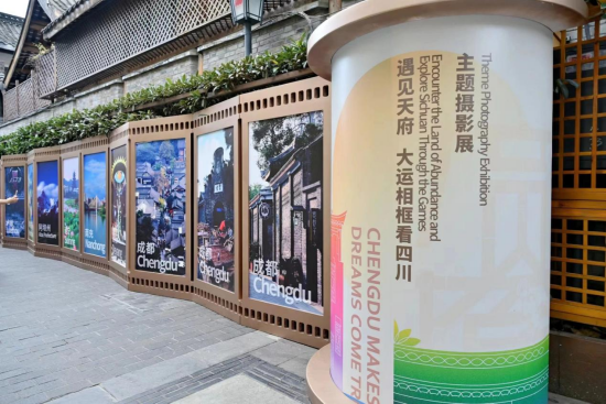 在宽窄巷子街区公共区域陈列着各市州文化旅游摄影作品,以“大运相框看四川”为主题,汇聚影像力量,展示四川魅力。
