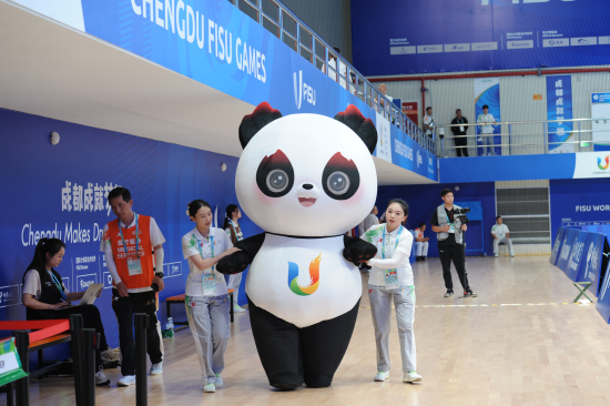 8月5日,大运会第8个比赛日,青羊赛区西南财大光华校区体育馆,迎来了女子排球9-10名排位赛和女子排球5-6名排位赛,分别是中国台北队对阵阿根廷队、意大利队对阵德国队。可爱的蓉宝也现身比赛现场,一起为选手加油打气。