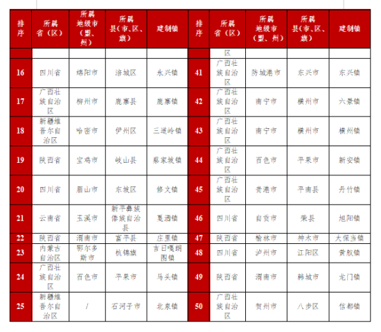 四川5个建制镇上榜,分别是绵阳市涪城区青义镇(位列全国336名、西部15名)、绵阳市涪城区永兴镇(位列全国379名、西部16名)、眉山市东坡区修文镇(位列全国410名、西部20名)、自贡市荣县旭阳镇(位列西部46名)、泸州市江阳区黄舣镇(位列西部48名)。