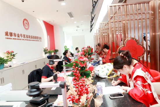 婚俗文化是华夏文明的一部分,它从侧面反映人类文化,书写漫长历史与浪漫岁月。据悉,此次七夕是金牛区市民中心婚姻登记处提质打造和场景空间升级后的新亮相,在原有的爱情元素基础之上,金牛区民政局还在场景中融入结婚证、纪念币、报刊杂志、婚书等婚俗文化元素,打造巴蜀婚俗文化长廊,营造良好的文化氛围,让婚俗文化改革之风吹遍金牛。