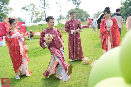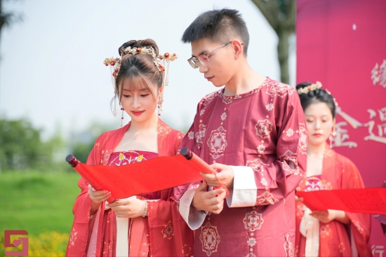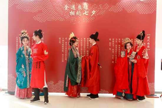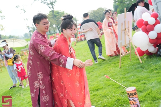 在府河摄影公园婚姻登记处,一场“金遇良缘·相约七夕”集体颁证仪式暨七夕汉服游园会也火热开展中。“霓裳有约”“鹊桥相会”“千里婵娟”等主题体验,舞台互动、乞巧穿针、画眉添妆等游戏互动,在考验新人们默契的同时,号召响应移风易俗。此外,活动为新人精心定制同心锁,悬挂爱情树上,镌刻长久爱意。以汉风文化为主题的游园活动,促进提升广大群众对七夕这一传统节日的认知度,培育文明和谐的社会风尚,营造健康文明、奋发向上的社会氛围。