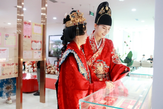 踏着红毯,缓缓步入金牛区政务中心婚姻登记处,凤冠霞帔明艳华丽,还原从盛唐到宋明不同朝代婚礼背景下的婚服,将婚俗文化变化直观地呈现在人们面前。“金‘遇’良缘,七待有你”——七夕游园主题活动设置6场不同主题中式概念展示,集观赏、互动、科普于一体。伴随着悠扬弦乐,猜词组句、婚服展示、品尝糕点等环节同时进行,讲述一段段琴瑟和鸣的恩爱故事。活动当天设置不同时间段进行集体颁证,并为新人送上由金牛个私协会化妆品分会倾情赞助的纪念品,祝福新人缔结良缘,同心永结,珠联璧合,让结婚承诺、颁证仪式成为群众喜闻乐见的新风尚。
