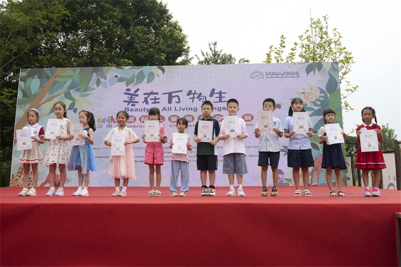 开幕式上,学生代表将人与自然和谐共生的理念融入歌曲,现场演唱了画展原创主题公益歌曲《美在万物生》,并且宣读了“生物多样性保护”儿童宣言,在温江向全国儿童、向世界各国儿童倡议:保护生物多样性从我做起,从每一件小事做起。从高山到雨林,从陆地到海洋,呵护万物自由生长,从现在做起,点滴做起,人人参与,人人保护。组委会还为参展小画家颁发了参展证书,鼓励他们在充满色彩的世界里,认知人与自然和谐共生的关系。