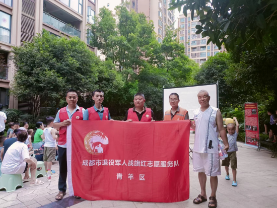 青羊区退役军人战旗红老兵放映志愿服务队,是一支2019年成立、拥有20名队员的队伍,服务队发起开展的“青羊区退役军人战旗红老兵放映志愿服务”项目,被成都市青羊区退役军人事务局评为“最具社会价值奖”,入选2022年度全国学雷锋志愿服务“四个100”先进典型名单。活动在实施过程中,除了播放红色革命老电影和具有教育意义的爱国主义题材的影片外,现场招募退役军人志愿者,积极吸纳老兵参与进来;在影前还开展革命历史、国防、安全消防、环保等知识竞猜问答和互动游戏,通过退役军人战旗红志愿者与居民们的积极参与互动,寓教于乐,强化退役军人思想政治教育引领作用,带动影响更多的退役军人、居民加入到社区治理和红色宣教爱国主义教育实际中来。