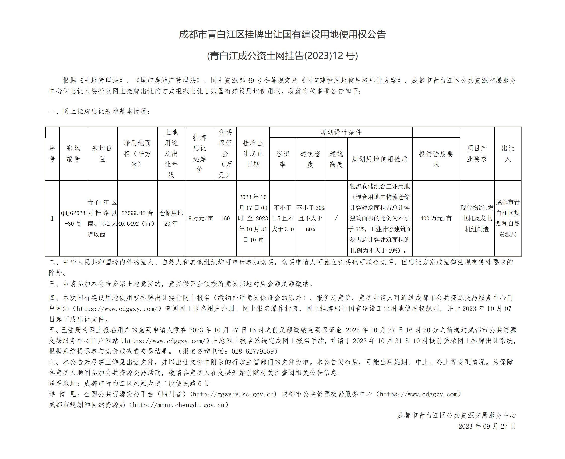 成都市青白江区挂牌出让国有建设用地使用权公告(青白江成公资土网挂告(2023)12号)