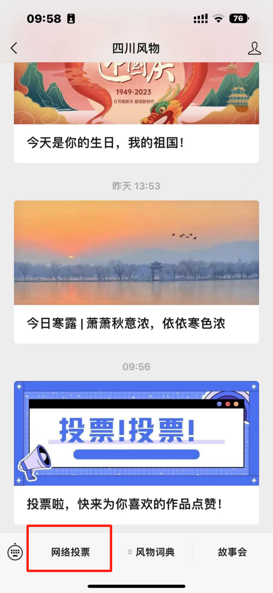 2、在“四川风物”会话页面,点击“网络投票”进入投票页面;