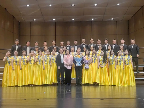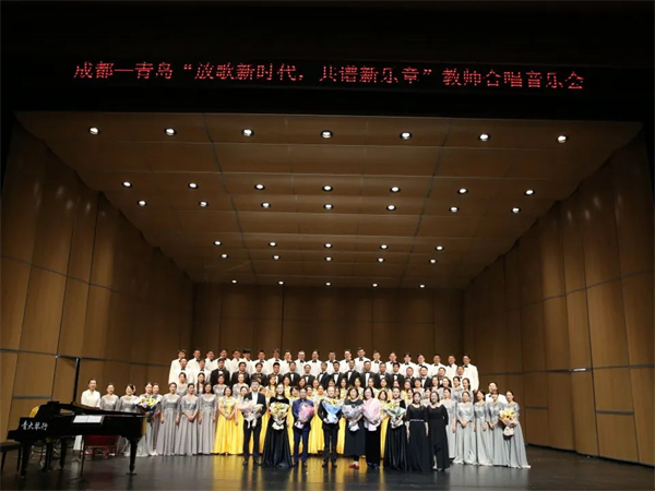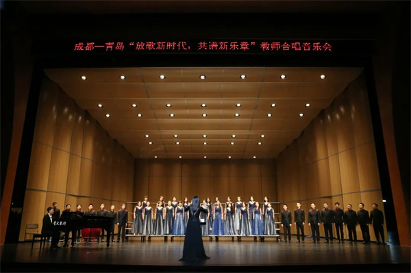 为了全面贯彻党的二十大精神,落实中共中央办公厅、国务院办公厅《关于全面加强和改进新时代学校美育工作的意见》,为建设一支高素质专业化创新型音乐教师队伍,落实《中共中央国务院关于全面深化新时代教师队伍建设改革的意见》要求,2023年10月22日,由成都市教育局、青岛市教育局共同主办的“放歌新时代,共谱新乐章”合唱音乐会在青岛城阳大剧院盛大举行。成都市教师合唱团受邀参加本场音乐会,带来了风格各异的8首合唱作品,包括:《再别康桥》《吉祥阳光》《念奴娇·追思焦裕禄》等经典作品。这场音乐会吸引了山东省合唱专业和音乐同行的关注并给予高度重视。此外,青岛市教育局、青岛市音乐家协会、青岛大学、城阳教体局、城阳音乐家协会领导与专家受邀参加此次活动。