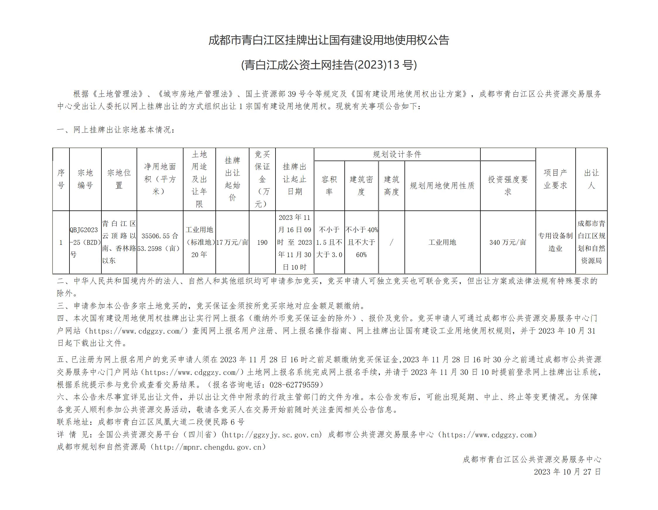 成都市青白江区挂牌出让国有建设用地使用权公告(青白江成公资土网挂告(2023)13号)
