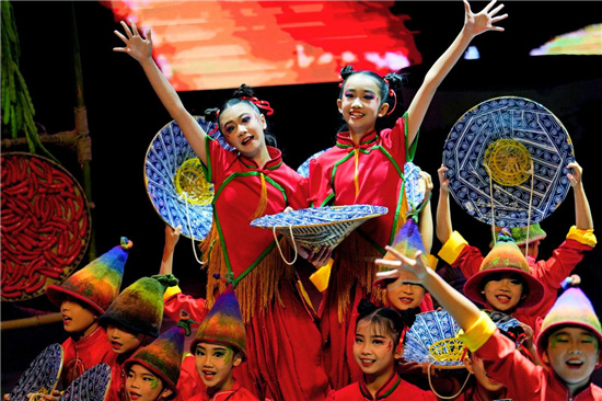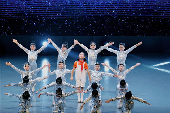 四川省成都西藏中学带来的作品《俄朵声声》取材于西藏自治区的非遗项目“俄朵”即抛石绳。学生们把藏区人民喜闻乐见的生产劳动和体育活动进行艺术加工,展现了西藏学生的自信、阳光、快乐和幸福。