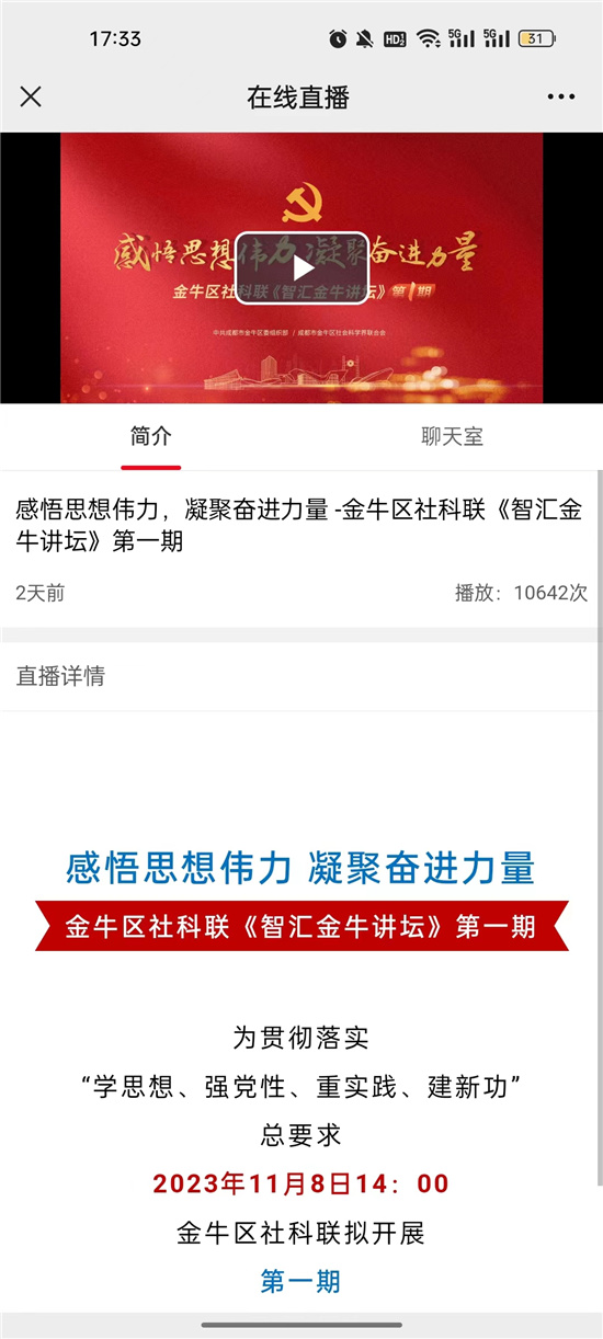 四川新闻网-首屏新闻成都11月9日讯 为深入推进学习贯彻习近平新时代中国特色社会主义思想主题教育走深走实,不断增强对党的创新理论的政治认同、思想认同、情感认同,11月8日,金牛区社科联“感悟思想伟力,凝聚奋进力量——金牛区社科联《智汇金牛讲坛》第一期”正式开讲。