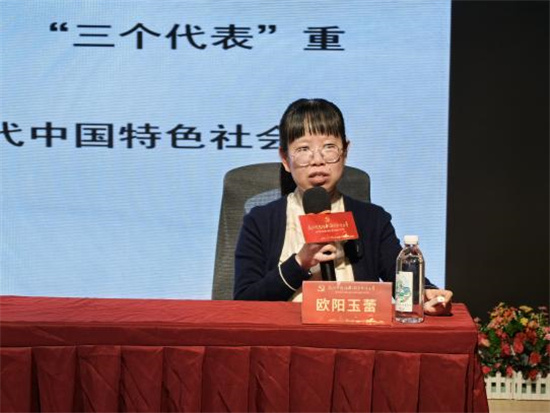 此次活动邀请中共四川省委省直机关党校科社法学教研部副教授欧阳玉蕾为大家作主题教育党课。欧阳玉蕾从习近平新时代中国特色社会主义思想的创立背景、科学内涵、重要地位三个方面展开讲解,深入浅出讲授了中国特色社会主义进入新时代这一我国发展新的历史方位所带来的历史性变化、国际方位迎来的历史性变迁以及党的建设面临的历史性考验,讲述了习近平新时代中国特色社会主义思想的主要内容、科学思想理论体系等。培训内容深刻独到、旁征博引,既有理论高度又兼具针对性和指导性。