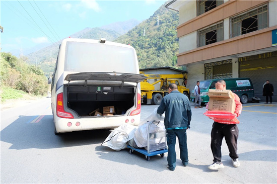 此时,一辆印有“四川乡村客运”的大巴车像往常一样准时驶进处理中心。客车师傅雍美波打开车尾货箱,和邮政工作人员一起,熟练地将送往蜂桶寨乡、硗碛乡的几大包邮件装上车。恰逢“双11”电商大促,进村的邮件也多了起来,不一会儿,货箱就装得满满当当。